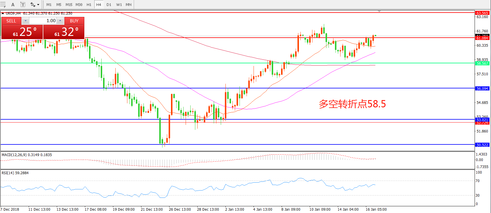 4小时图看,油价经过连续整理突破61美元,但短期内依然呈现震荡形态, 均线系统呈多头排列,但MACD红柱缩短,重点关注55周期均线支撑。