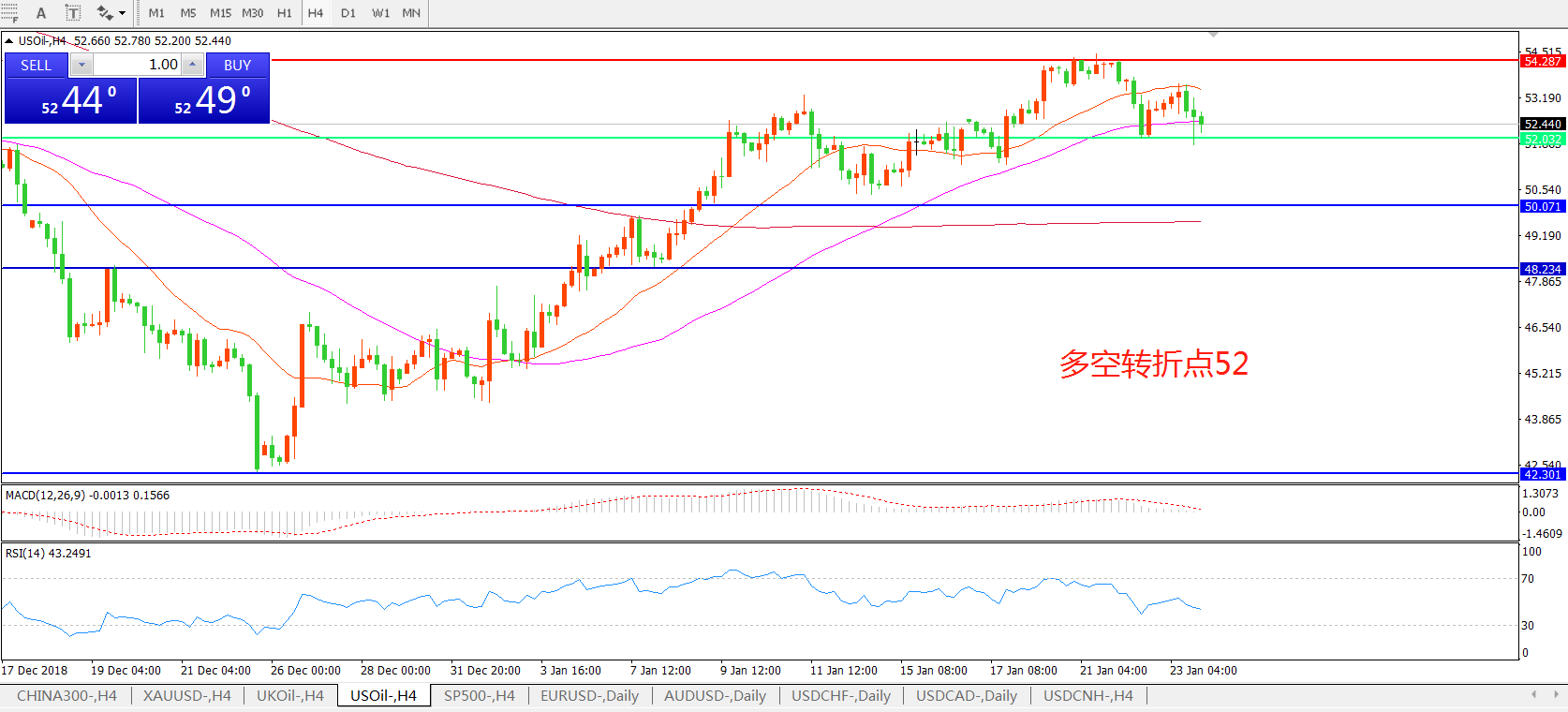 4小时图看,油价经过连续整理站稳52美元,短期整理后受制于54美元关口, 均线系统呈多头排列, MACD红柱增加,重点关注上方阻力。