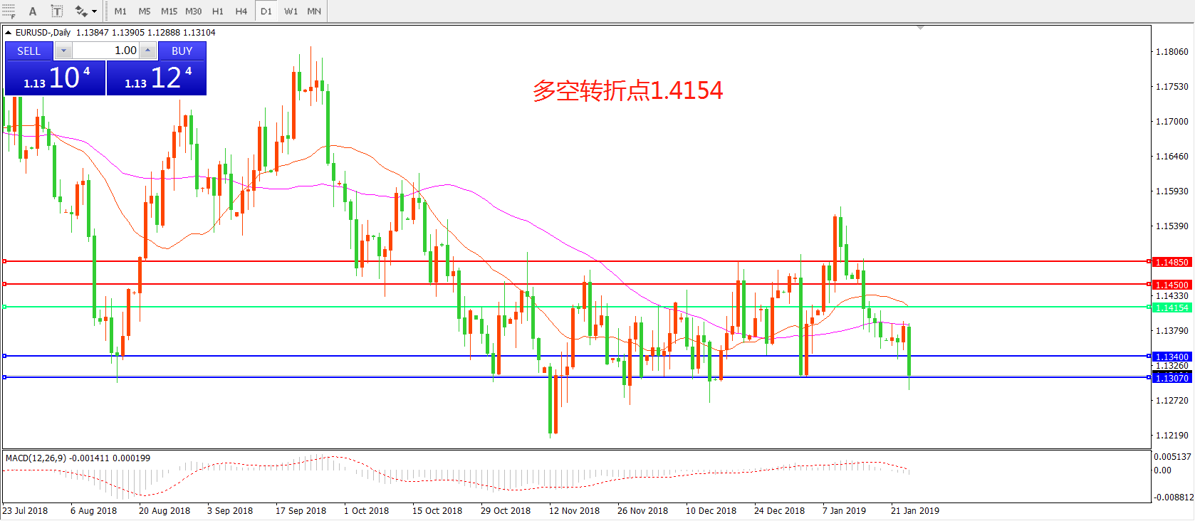 日图均线有拐头迹象,MACD穿越0轴下行,绿柱增加,价格连续下破,险守于1.1307支撑位置,短期整理后,关注支撑是否有效。