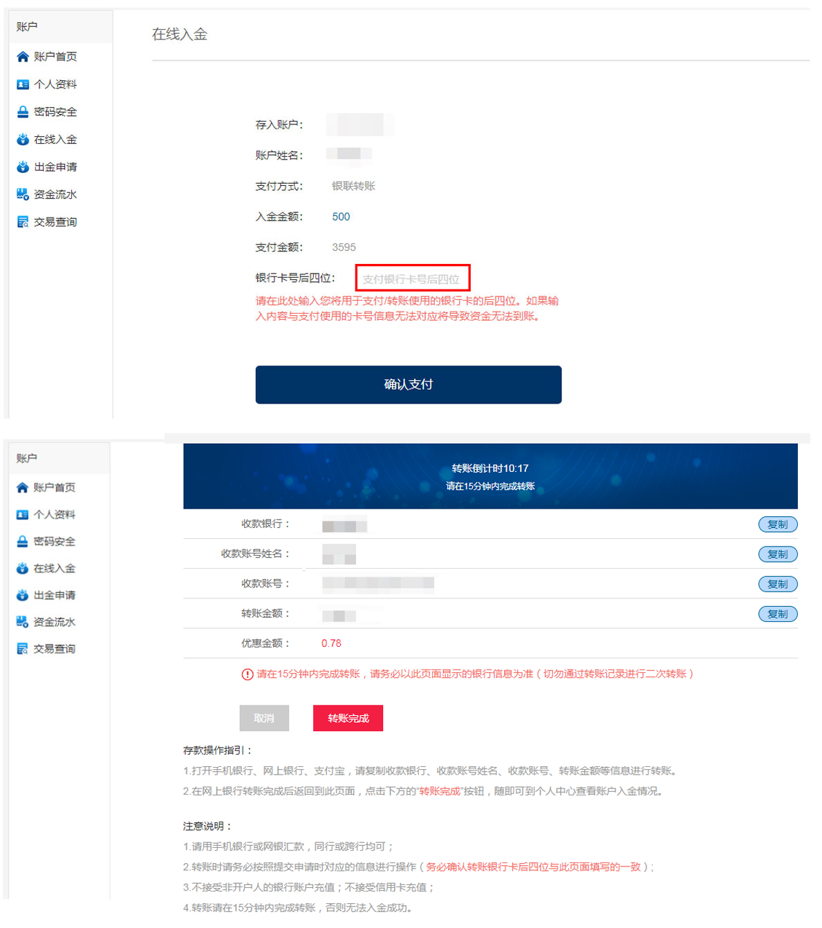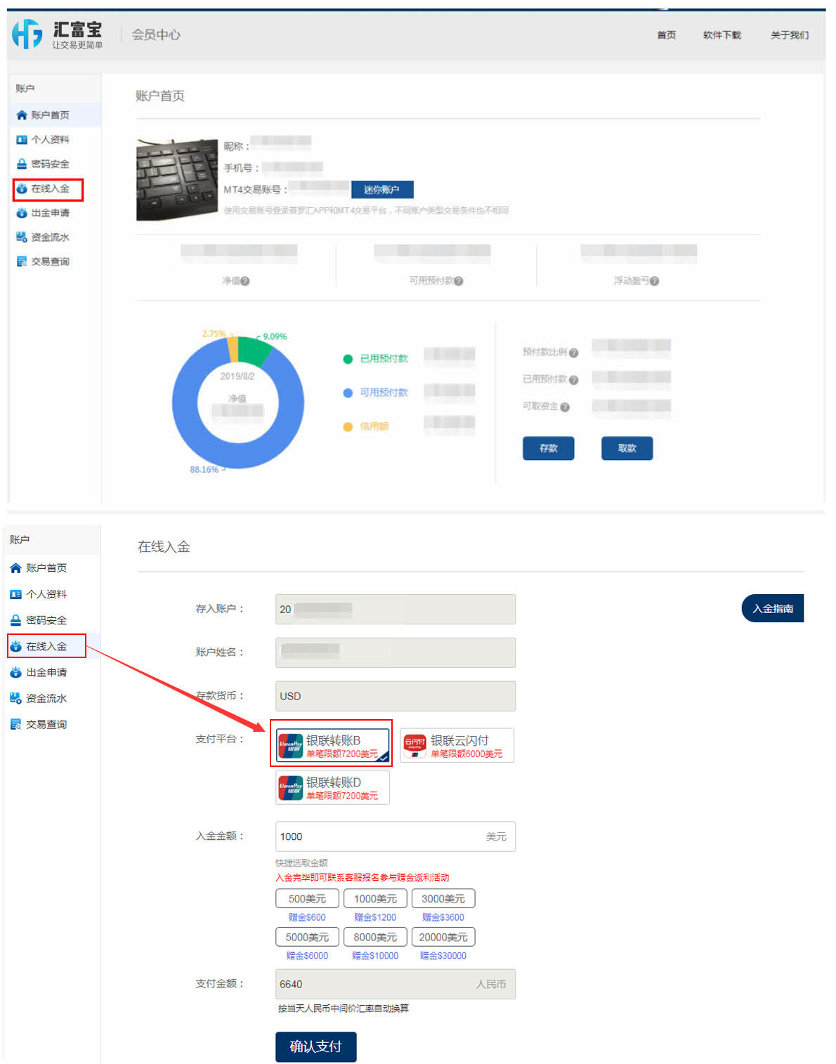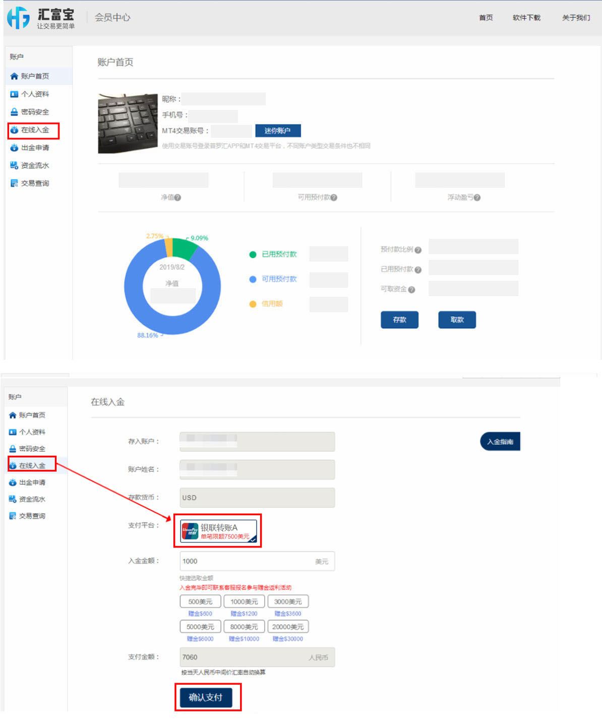 登入后,于菜单中选择「在线入金」或「存款」按鈕,点击后选择「银联转账」。按指示选择输入入金金额后点击「确认支付」。