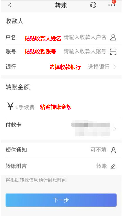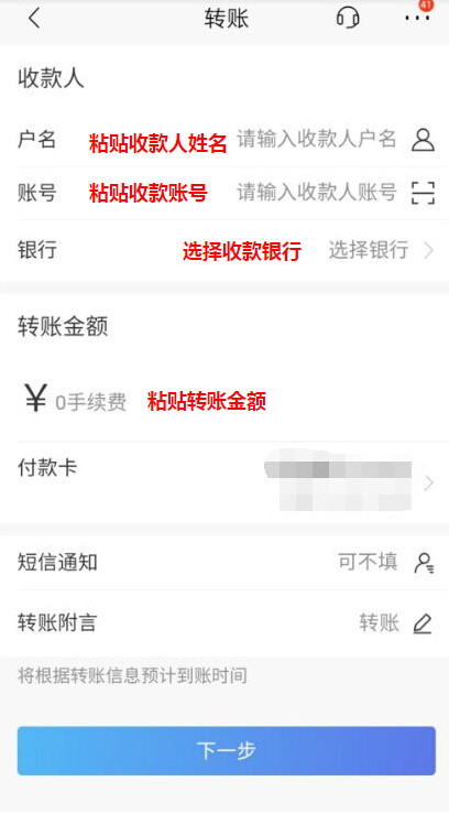 将收款人金额、姓名、卡号、银行粘贴到手机银行的转账页面。