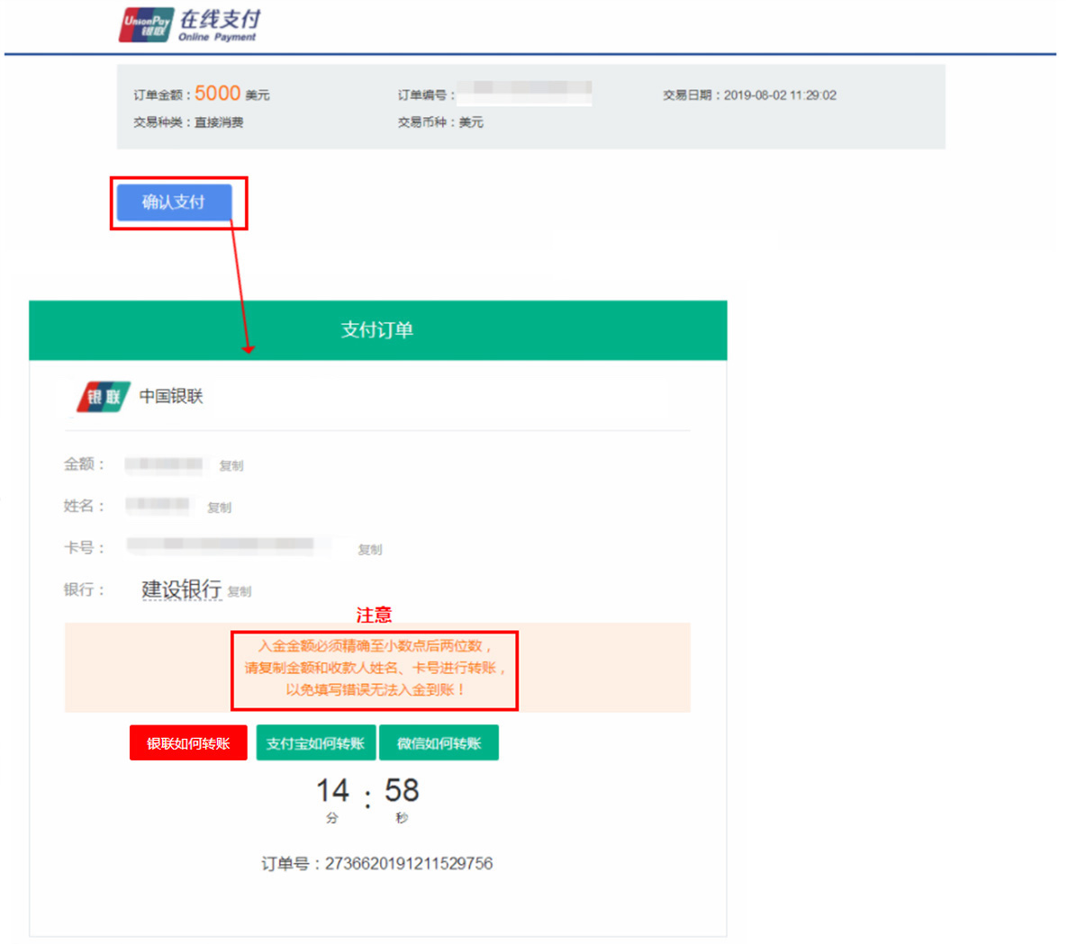 确认支付信息并填写支付/转账的银行卡后四位,点击「确认支付」,复制收款人信息到手机银行或网银转账页面。