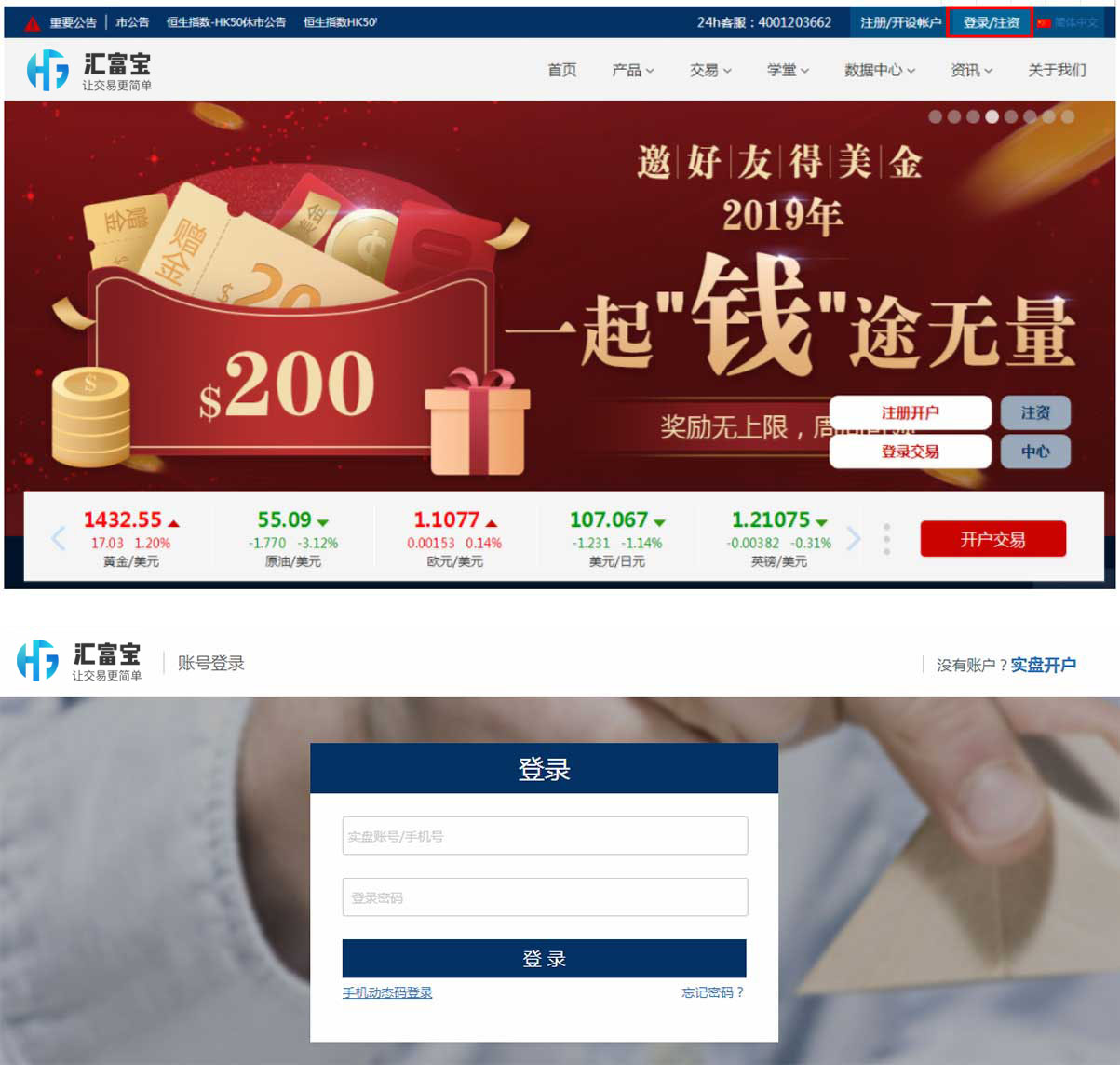 进入汇富宝网站首页点击右上角「登录/注资」登录到个人用户中心