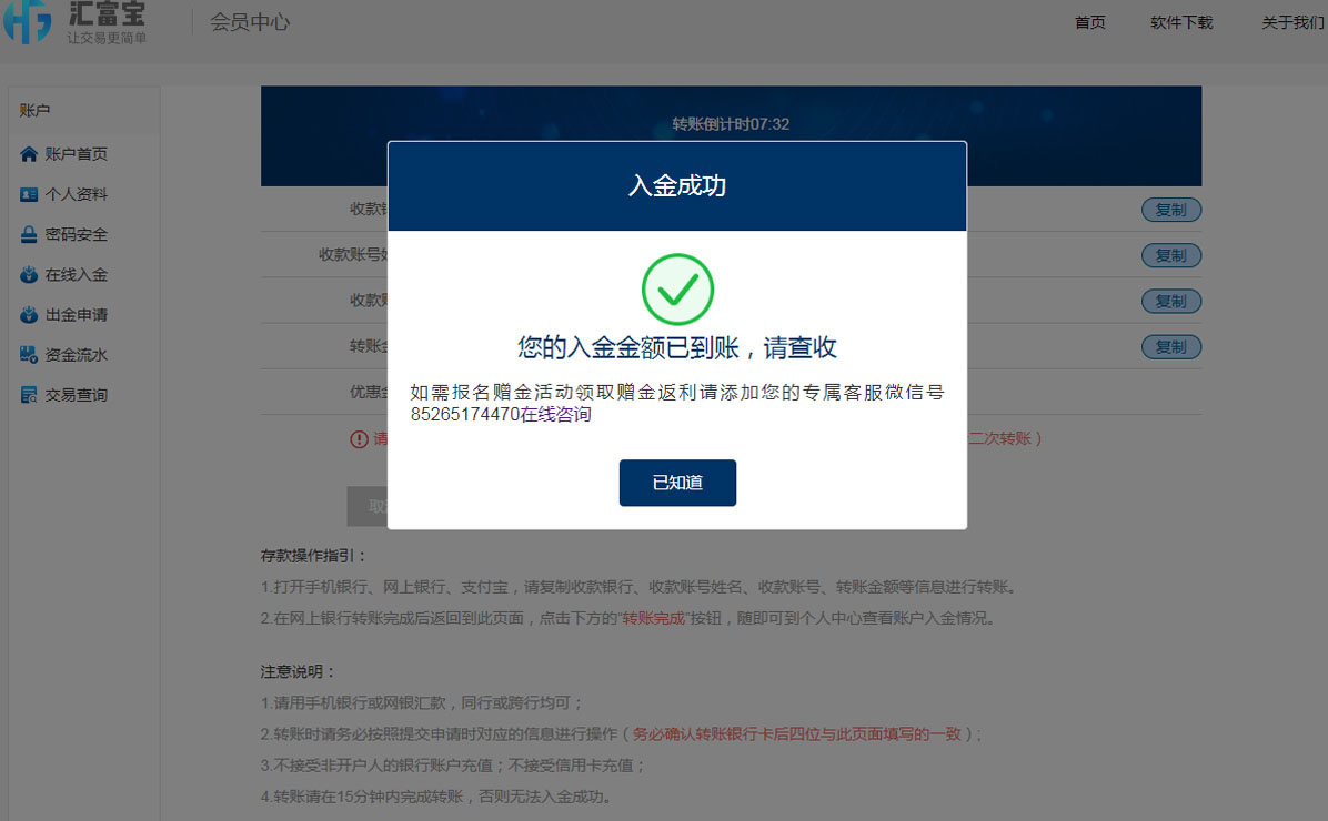 转账完成后返回到个人用户中心点击右下角「转账完成」即完成入金
