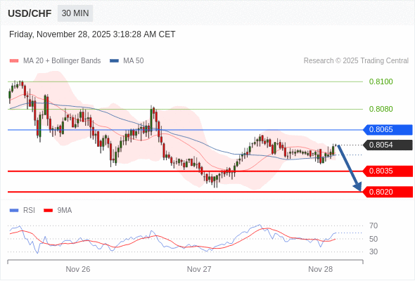 在 0.8065 之下,看跌,目标价位为 0.8035 ,然后为 0.8020 。