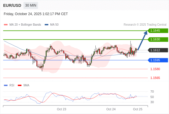 在 1.1595 之上,看涨,目标价位为 1.1630 ,然后为 1.1645 。
