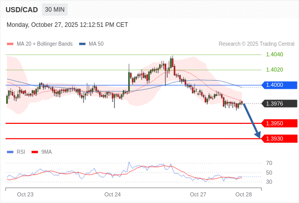 交易策略: 在 1.4000 之下,看跌,目标价位为 1.3950 ,然后为 1.3930 。