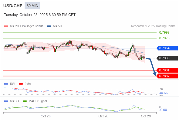 美元/瑞郎 当日内 : 看跌,在 0.7954 之下。