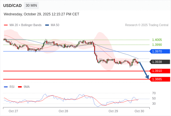 在 1.3970 之下,看跌,目标价位为 1.3910 ,然后为 1.3885 。