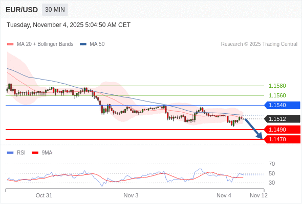 在 1.1540 之下,看跌,目标价位为 1.1490 ,然后为 1.1470 。