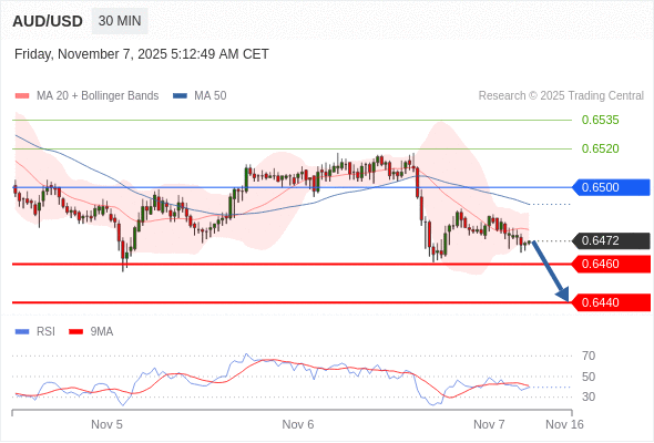 在 0.6500 之下,看跌,目标价位为 0.6460 ,然后为 0.6440 。