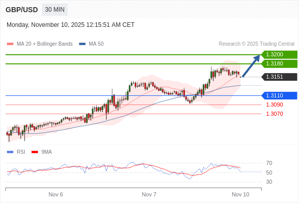 在 1.3110 之上,看涨,目标价位为 1.3180 ,然后为 1.3200 。