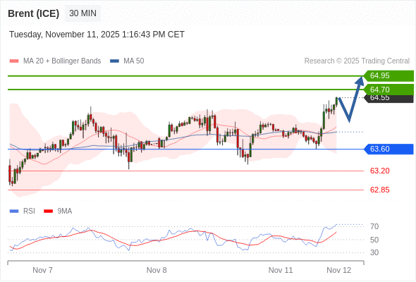 在 63.60 之上,看涨,目标价位为 64.70 ,然后为 64.95 。