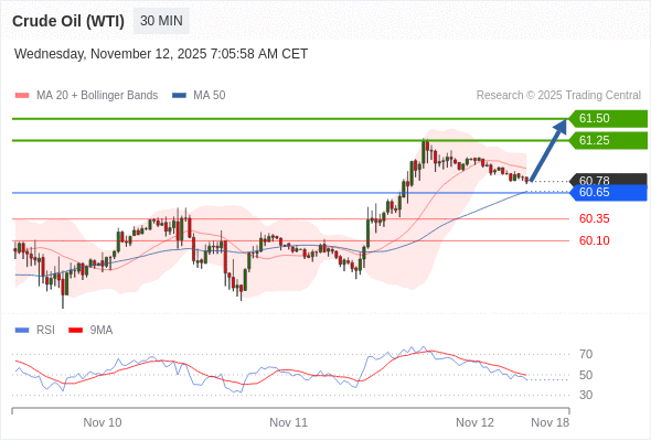 在 60.65 之上,看涨,目标价位为 61.25 ,然后为 61.50 。