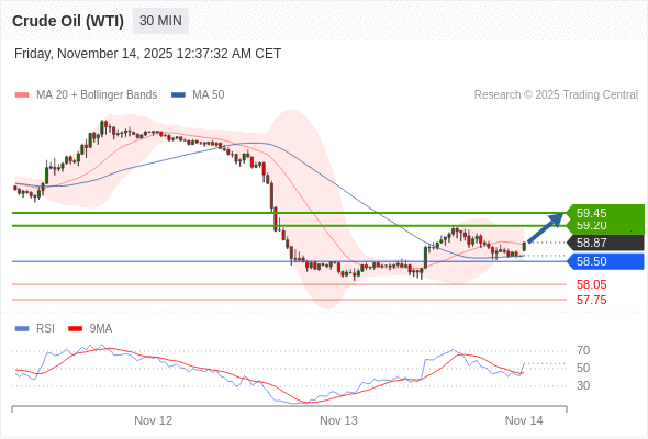 在 58.50 之上,看涨,目标价位为 59.20 ,然后为 59.45 。