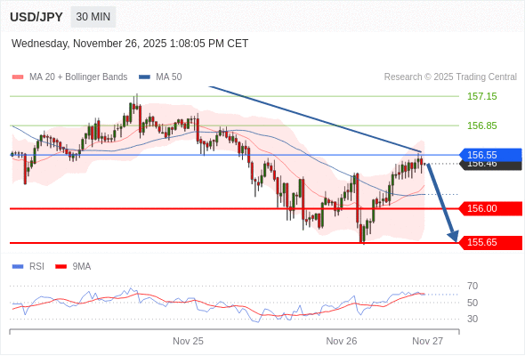 在 156.55 之下,看跌,目标价位为 156.00 ,然后为 155.65 。