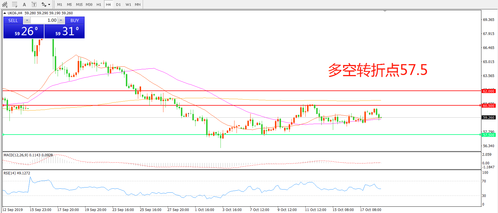 4小时图看,油价延续低位震荡格局,60.5美元成为上方明显阻力,均线系统粘合形成下方支撑,MACD红柱缩短,RSI指标走平,日内延续震荡概率较大。