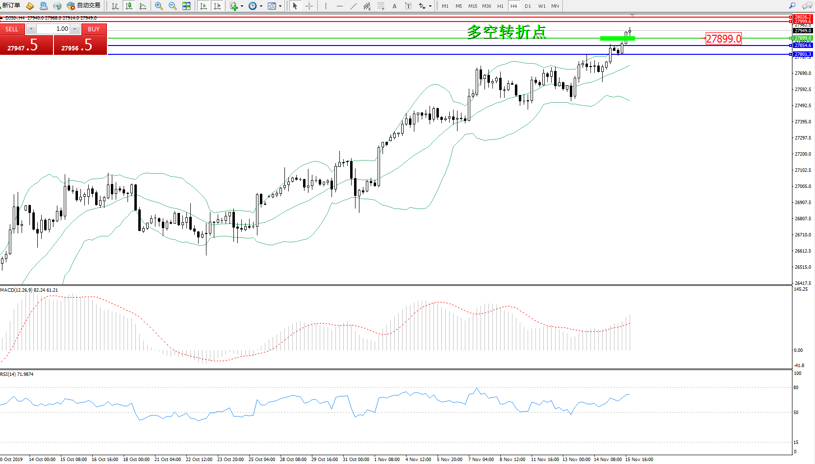 道琼斯指数1115日(周五)收盘上涨222.70点,涨幅0.80%,报28004.69点。史上首次突破28000点里程碑。关于贸易协议进展的官员讲话提振了市场情绪。市场对第一阶段协议获得批准的最后阶段非常乐观。这一直是全球经济最大的逆风,而冲突得到重大缓解,投资者同时还在关注美国零售销售等多项经济数据。