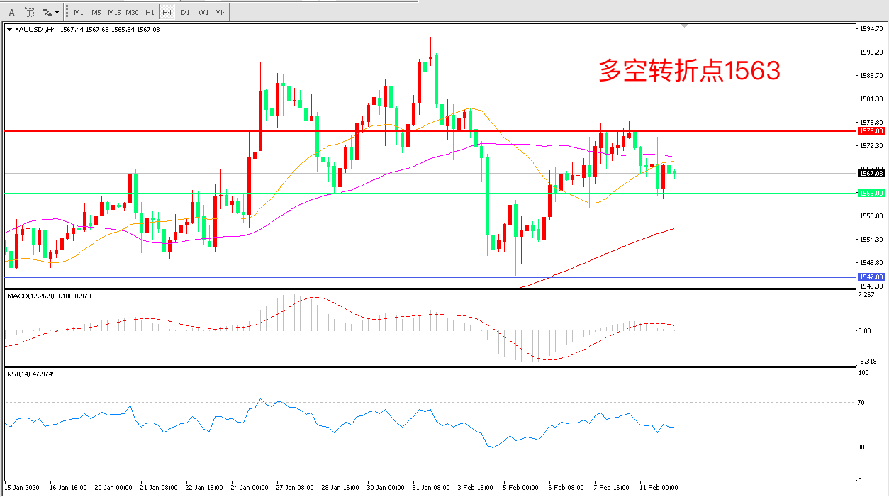 4小时图看,金价呈现区间震荡形态,上方阻力为1575,下方支撑为1563,均线系统走平, MACD红柱缩短,RSI指标走平,日内延续上行概率较大。
