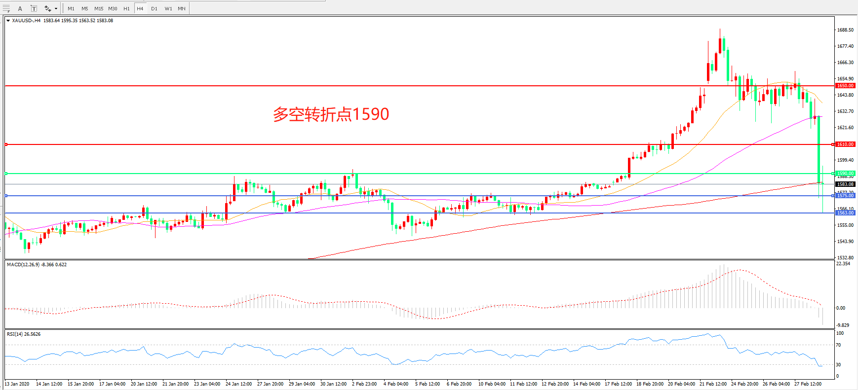 4小时图看,金价长阴下破,前期涨幅基本被吞没,上行走势被破坏,200周期均线成为多空争夺焦点, MACD绿柱增加,RSI指标走平,如能收复1590一线,金价有望止跌反弹。
