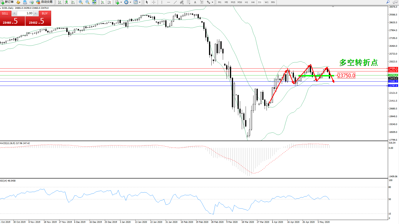 道琼斯指数5月12日(周二)收盘下跌457.20点,跌幅1.89%,报23764.78点。美股三大指数大幅收跌,航空股、银行股跌幅居前。大型科技股均走低,微软、亚马逊、奈飞、谷歌跌约2%。美国总统特朗普继续呼吁美联储实施负利率政策,美元走低、美债收益率下滑,随着全球主要经济体重启商业与交通基础设施,交易商与投资者都在评估极有可能出现的‘第二波’疫情及其可能造成的经济影响。越来越多的市场人士认为经济复苏步伐将比现在预期的更慢。如果市场共识继续转向经济复苏缓慢,很有可能许多金融市场(尤其是股市)将出现大规模的重新估价,并且大幅回调。