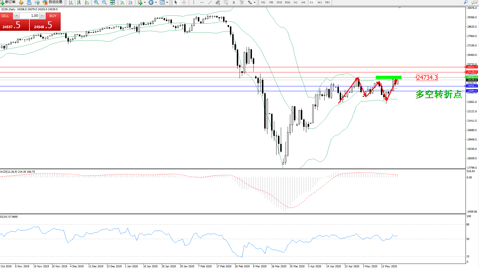 道琼斯指数520日(周三)收盘上涨369.00点,涨幅1.52%,报24575.90点。美国股市周三收创逾10周高点,能源、金融和科技股领涨投资者关注美国经济将继续重启的迹象。美联储周三公布的会议记录显示,委员们同意美联储致力于使用所有工具支撑经济,委员们预计将维持当前的利率目标区间,直到他们确信经济已经经受住了近期事件的冲击,并走上了实现美联储目标的轨道上;公开市场调查的受访者认为,FOMC实施负利率的可能性几乎为零。自3月中各州开始实施居家令以减缓病毒传播以来,已有超过3600万美国人请领失业金。经济学家预计失业率将接近或超过大萧条时期创下的25%的纪录。预测人士称,他们预计本季美国经济环比年率将萎缩高达50%