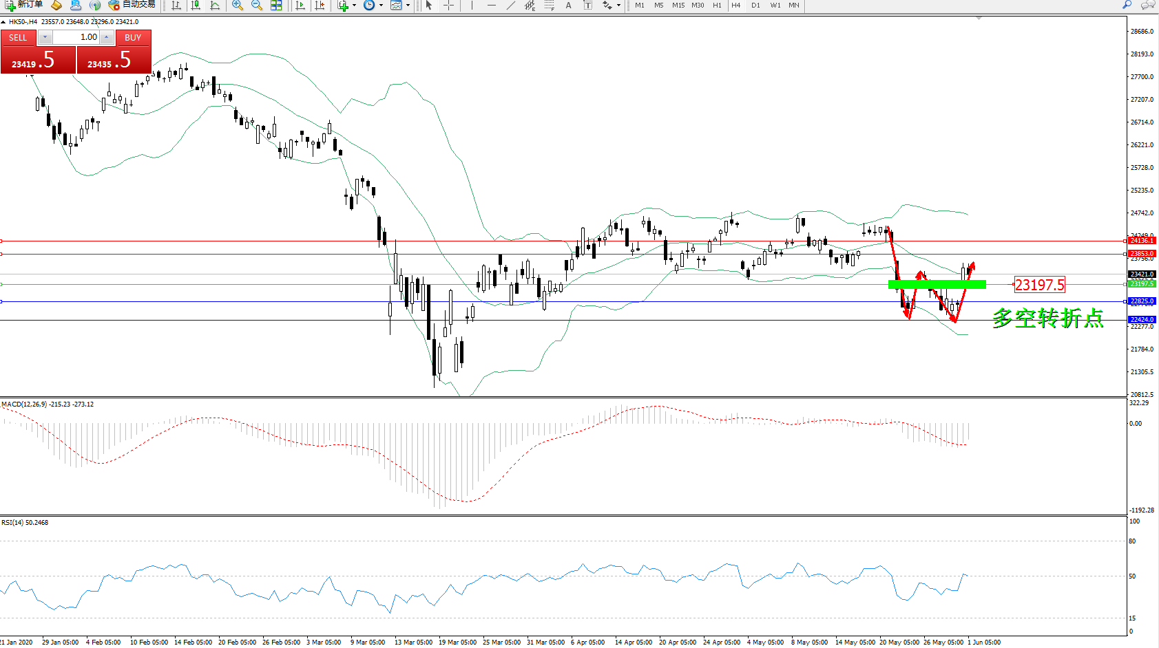 香港恒生指数6月1日(周一)收盘上涨771.05点,涨幅3.36%,报23732.52点;港股市场集体上涨,恒指大幅收涨3.36%报23732点升近800点,创3月底以来最大涨幅。国指涨2.85%报9833点。大市成交量为1507.53亿港元,南下资金净流入29.54亿港元。行业板块全线走高,阿里概念、半导体、生物医药领衔大涨,中芯国际飙升近8%;手机概念股、中资券商股、内房股集体爆发,恒指国指成份股4成以上涨超4%,腾讯大涨4.53%,港交所大涨4.66%;美团点评收涨近3%,续创历史新高。从数据来看,各项指标在逐步好转,复工复产在加速推进,内需和投资这块需要看政策力度。另外,国际贸易如果出现超预期对大盘会有刺激。