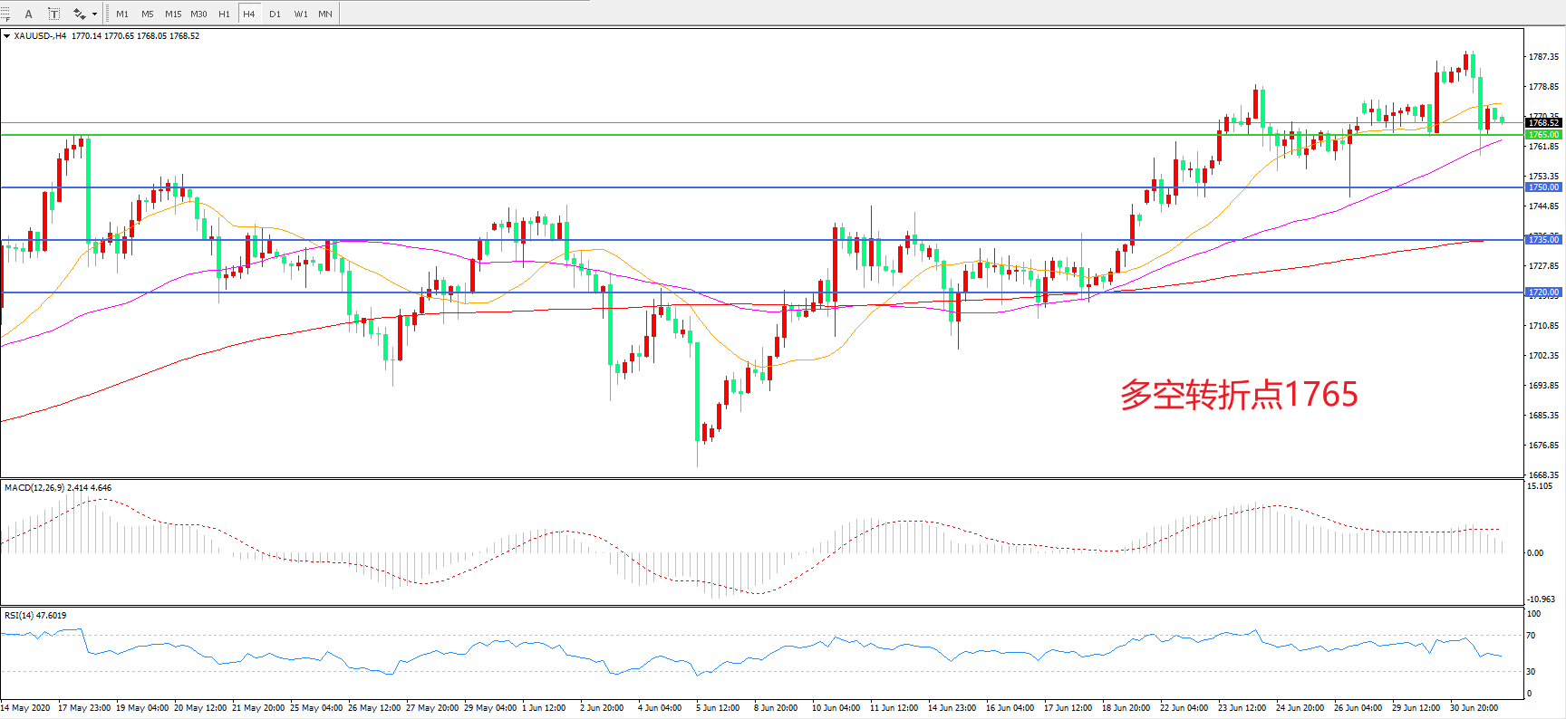 周三(7月1日),新冠病毒疫苗利好消息突袭市场,由辉瑞公司开发的新冠病毒候选疫苗的研究显示,这种药物可以产生中和抗体,避险情绪的回落引发了获利了结,现货黄金短线大幅下挫,收报1768.42美元/盎司,但整体来看,仍处于上行趋势之中。
