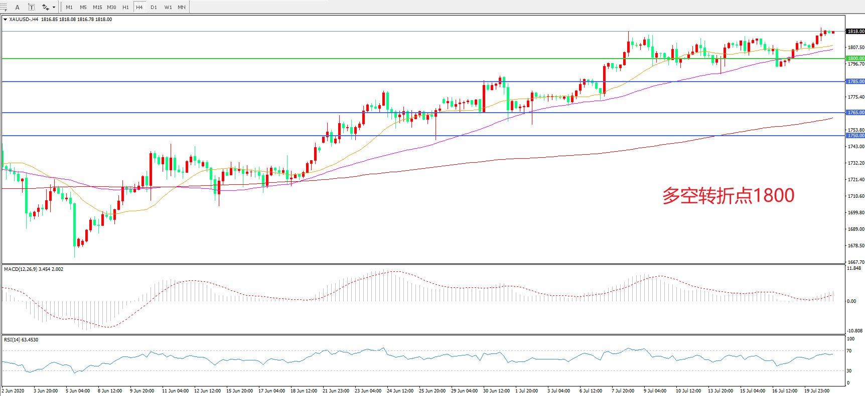 交易策略:在1800.00之上看涨,目标1820.00   1845.00