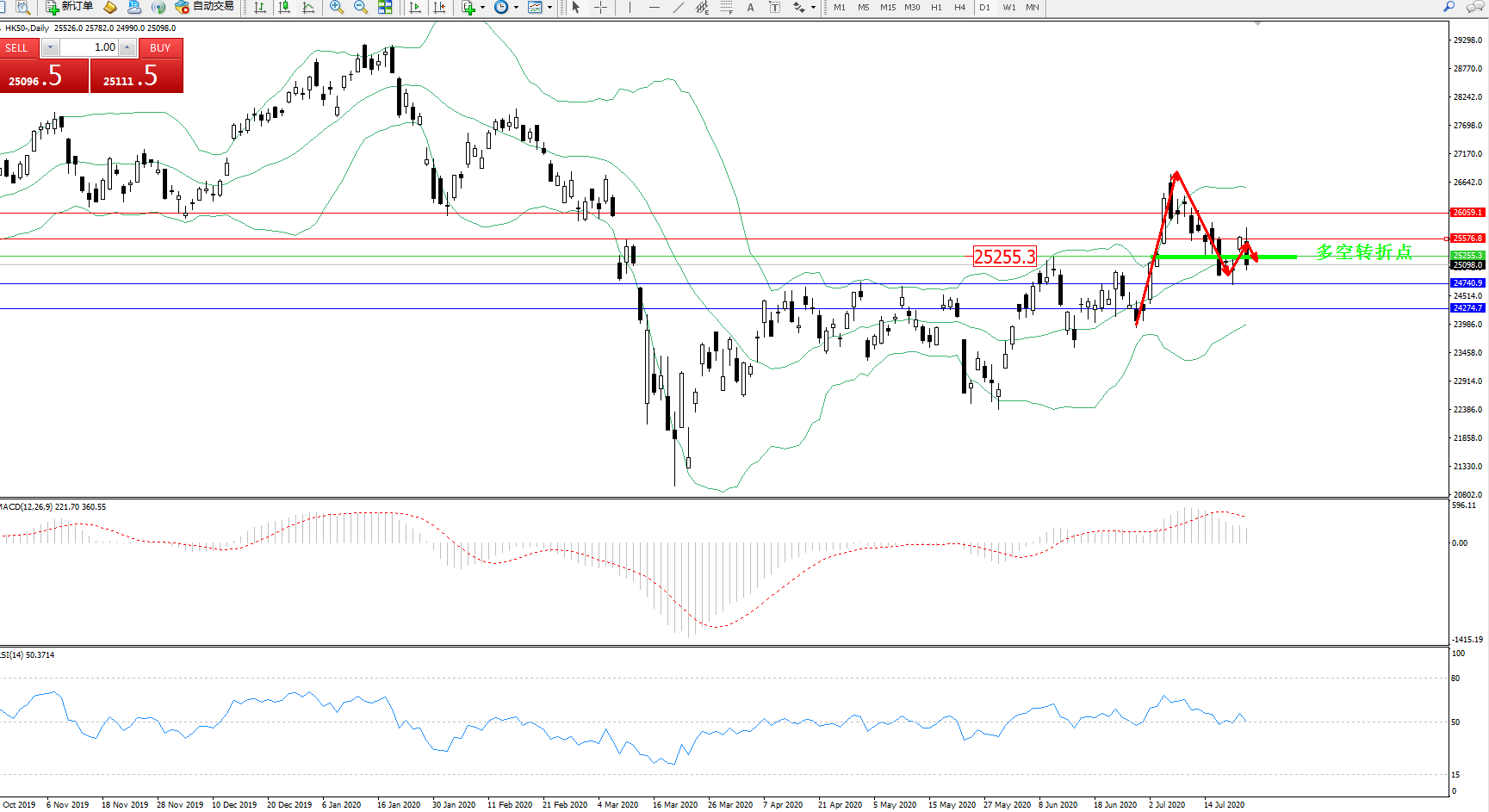 技术点评:多头动力长时间维持在布林带指标中轨附近来回震荡,布林带指标呈收口走势后依旧处于向上拉升趋势中,关注中轨25576附近关键转折点,市场正在此处寻找最佳方向,MACD指标处于多头区域高位弱势整理回撤后开始走平,RSI指标高位空头动力缓慢回撤至50均衡线附近持续整理数日后维持整理平移中;