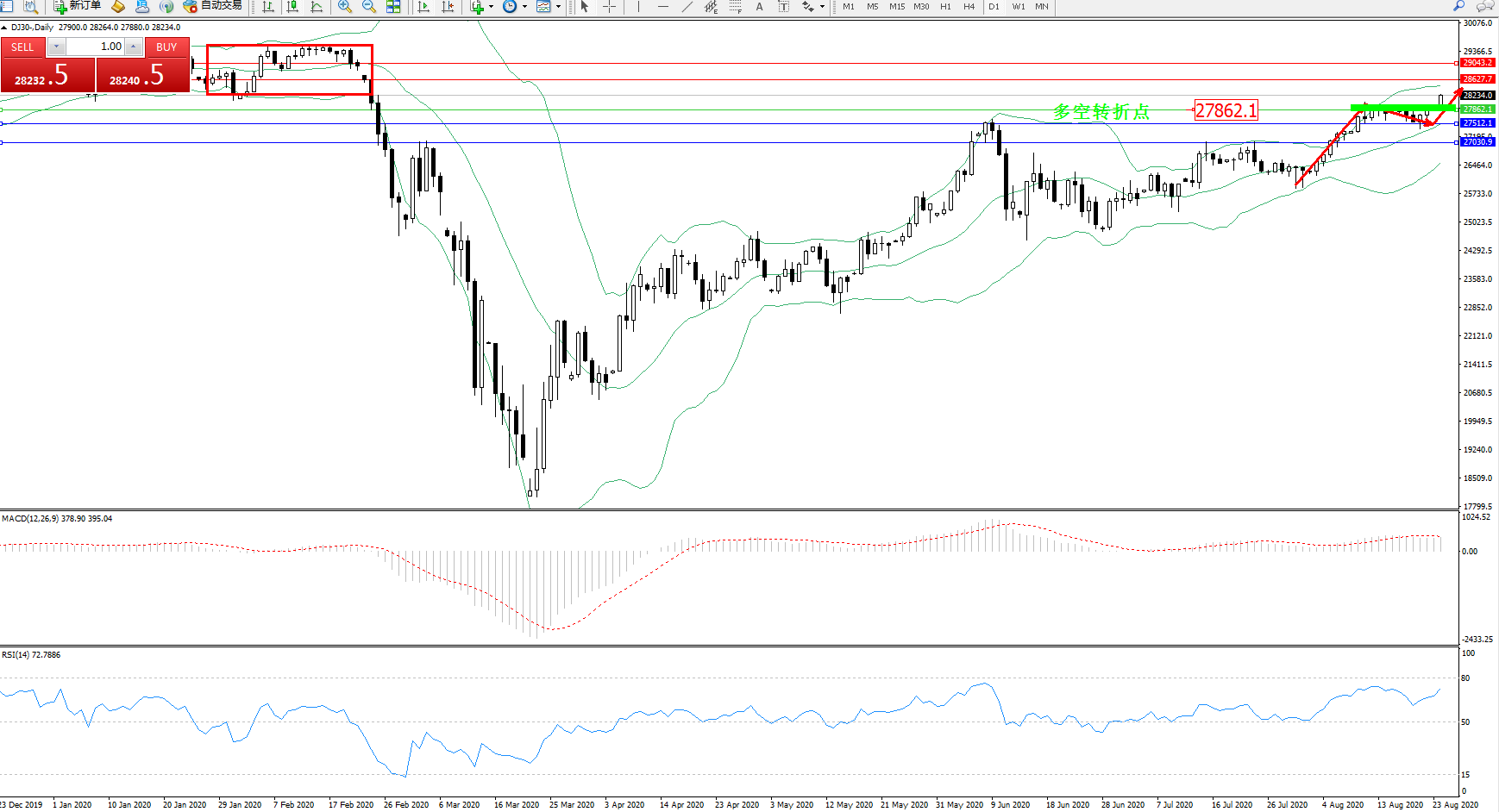 道琼斯指数8月24日(周一)收盘上涨378.10点,涨幅1.35%,报28308.46点。美股三大指数集体收高,国债下跌,因有迹象显示特朗普政府可能加速批准冠状病毒疫苗和治疗方法。标普500指数再创新高,因为人们乐观地认为病毒不会阻碍经济增长;纳斯达克综合指数也连续连续第二个交易日收于创纪录水平,从更强劲的经济重启中受益的公司领涨。鲍威尔周四的讲话可能是下一个推动美元走势的主要因素,投资者关注他的讲话,看他是否会暗示美联储将把通胀目标调整为一个平均水平。这将允许通胀在美联储加息前升到比之前高的水平,弥补过去数十年的温和物价上涨。据CME“美联储观察”:美联储9月维持利率在0%-0.25%区间的概率为100%,加息25个基点至0.25%-0.50%区间的概率为0%;11月维持利率在0%-0.25%区间的概率为100%,加息25个基点的概率为0%。