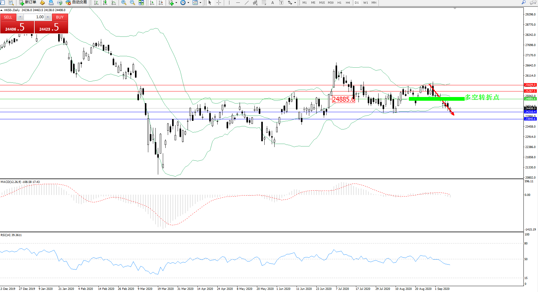 香港恒生指数9月9日(周三)收盘下跌155.41点,跌幅0.63%,报24468.93点;市场情绪依旧低迷,港股主要指数均收跌。恒生科技指数跌1.51%报7015点。生物医药B类股反弹明显,康宁杰瑞与康希诺均涨超6%;航空股走高,东航升4.5%;恒生科技股多数下跌,恒腾网络大跌超16%领跌,京东跌3%,美团、阿里均跌超2%,小米跌超1%。今日南下资金逆势净流入28.75亿港元,市场成交量继续萎缩,大市成交额为1207亿港元。中概股回归将也起到优化港股行业结构、提振港股整体与相关行业估值、提高交易活跃度,为市场引入源头活水等效用。港股科技、消费、医药等“新经济”行业正在酝酿新一轮投资机遇。恒指由7月初至今,大部份时间于24,200-26,000之间窄幅波动,估计于9月份向上突破的机会较高,利好因素包括美国联储局修改通胀目标、美元疲弱、人民币走强。