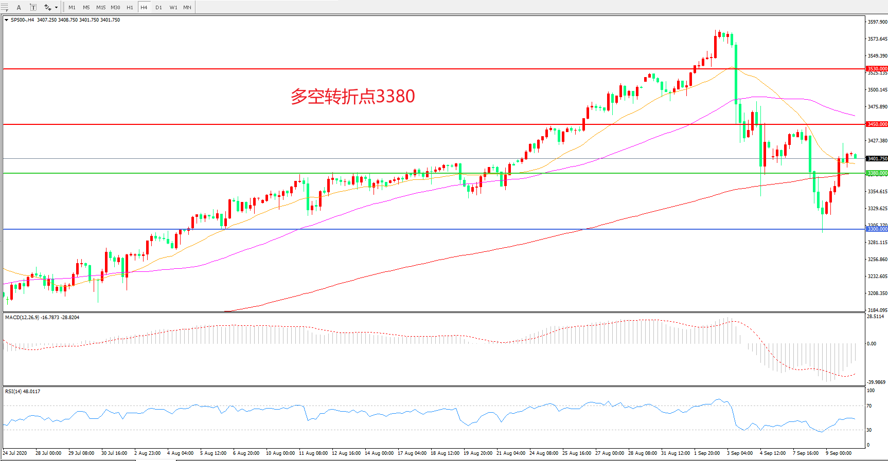 4小时图看,标普500震荡反弹,短期走势有所回暖,200周期均线成为短期支撑, MACD绿柱缩短,RSI指标走平,日内延续震荡概率较大。