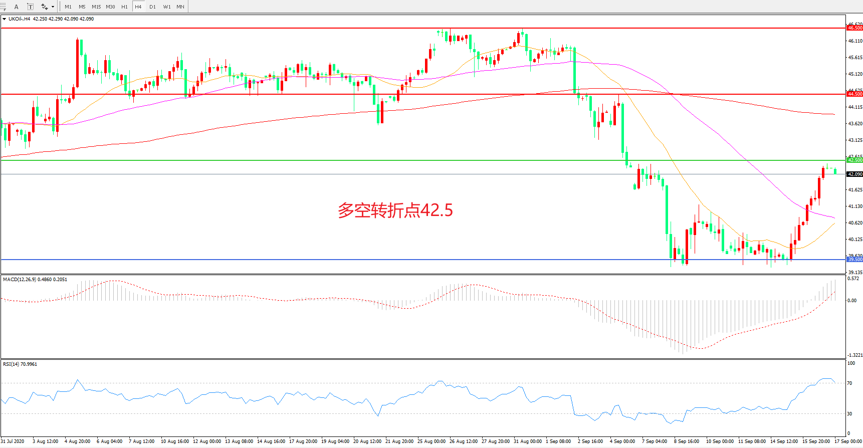 4小时图看,油价低位调整后连续反弹,短期走势明显回暖,42.5美元成为短期多空分水岭,短期均线拐头向上, MACD红柱增加,日内震荡上行较大。