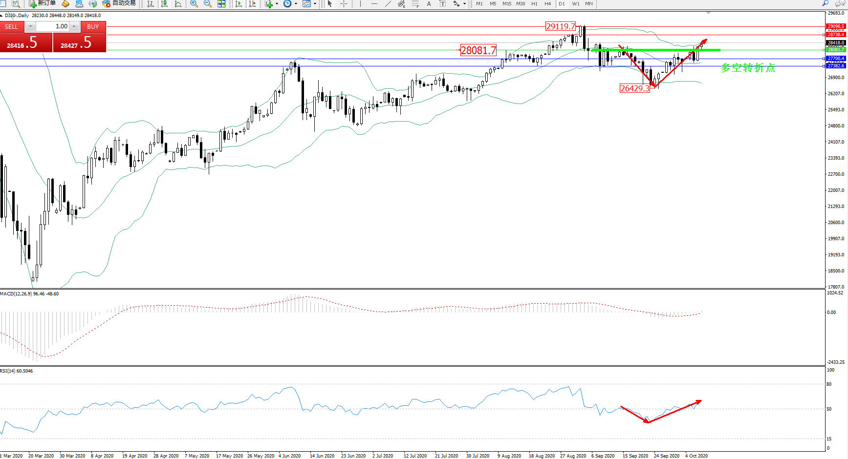 技术点评:空头动力延续布林带指标中下轨区间弱势下行至26429位置后得到支撑开始呈V型反转上移,触及布林带指标上轨附近后遇阻开始窄幅震荡中,但多头动力仍处于上扬拉升态势,有继续破上轨迹象,布林带指标呈收口平移走势后有张口迹象,短期或将有试探突破上轨位置节点迹象,MACD指标处于0轴线附近弱势徘徊中,RSI指标纠结于50均衡线附近持续整理后缓慢上扬;