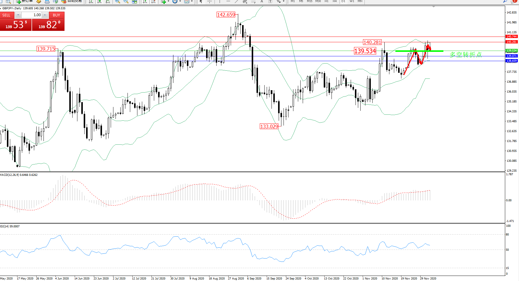 技术点评:多头动力延续布林带指标中上轨区间持续宽幅震荡向上移动态势良好,高位出现短暂回撤走势,期间多头动力试探上轨附近节点,前期高位140.281位置已再度触及,且有破位上扬迹象,布林带指标呈收口走势中,MACD指标处于多头区域持续整理平移中,RSI指标处于50均衡线上方维持整理走势向上移动中;