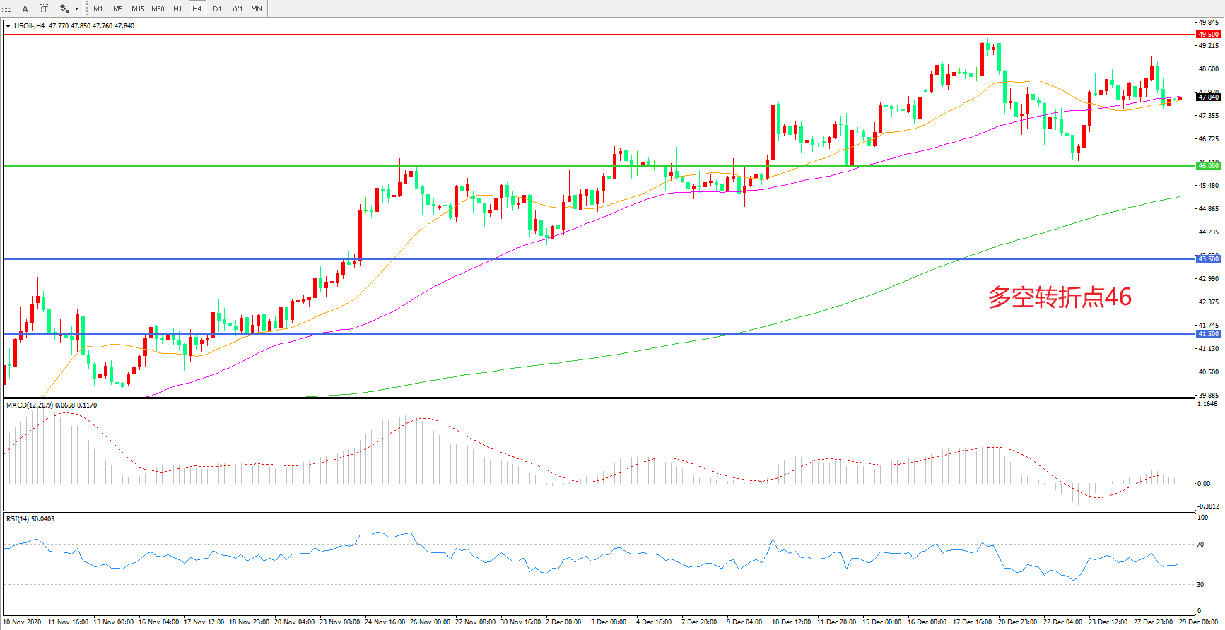周一(12月28日),美国总统特朗普最终签署了9000亿美元的新冠纾困法案,但市场做多的动能已经大不如从前,美国WTI原油先涨后跌,收报47.82美元/桶。从圣诞节之后的第一个交易日来看,成交量仍没有完全恢复,因此短期的市场走势还难以反映出全部的市场心态,但油价有短线二次探顶行情的迹象。
