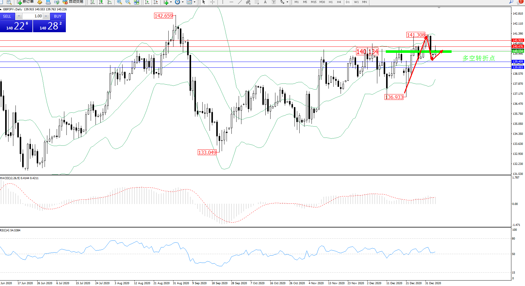 技术点评:多头动力延续布林带指标通道内持续宽幅震荡后持续拉升上扬,纠结于布林带指标中上轨区间高位整理,抵达141.308位置节点后出现快速回撤,触及布林带指标中轨附近节点后开始震荡,布林带指标呈张口走势后有收口迹象,MACD指标处于0轴线上方持续窄幅整理中,RSI指标处于50均衡线上方维持震荡后出现回撤向下移动;