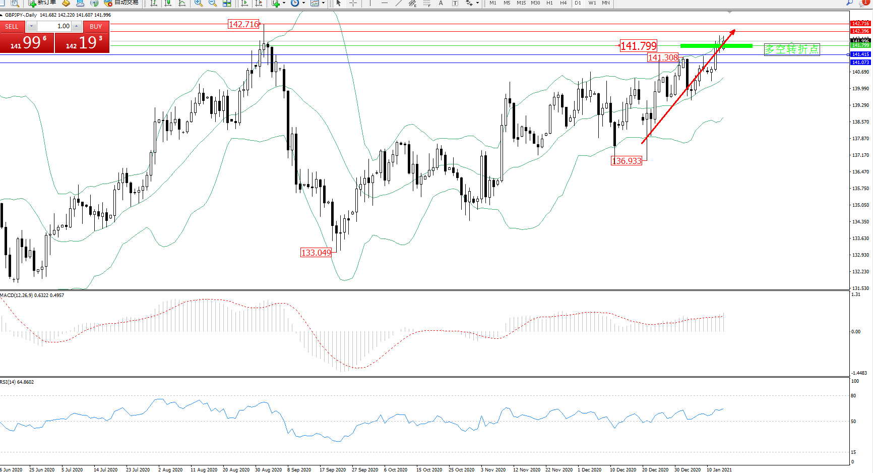 技术点评:多头动力延续布林带指标中上轨区间持续震荡上扬态势良好,前期高位142.716位置近在咫尺,破位在即,布林带指标呈上行趋势走势持续中,且未见止步迹象,关注上轨附近关键节点,MACD指标处于0轴线上方多头区域维持整理弱势徘徊向上移动,RSI指标处于50均衡线上方维持整理上行中;