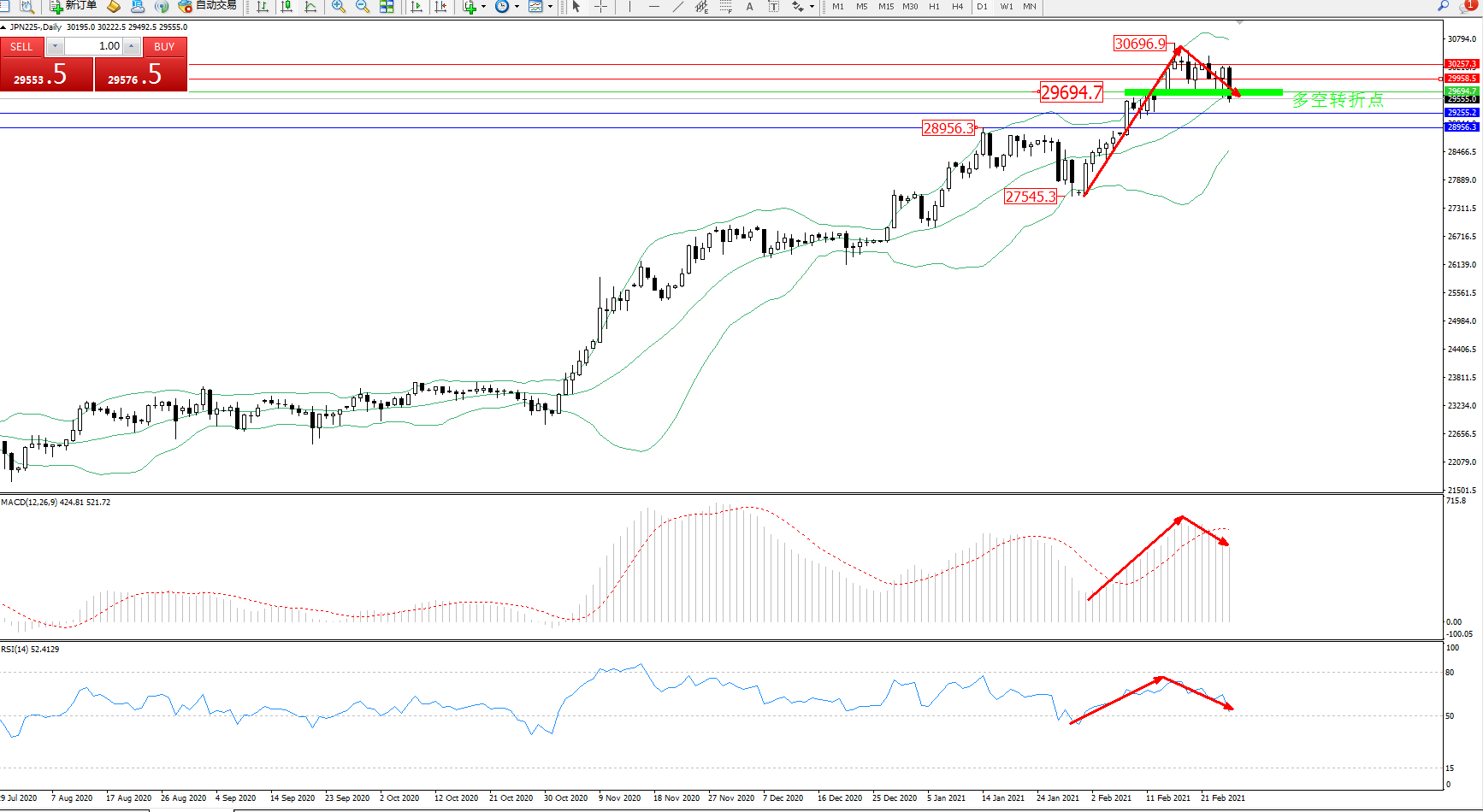 日经225指数2月25日(周四)收盘上涨499.30点,涨幅1.68%,报30171.00点。日本内阁官房长官加藤胜信:媒体有关政府正考虑暂停对缅甸的官方发展援助的报道不实。将在紧急状态结束后决定边境管制的情况。市场乐观情绪在隔夜美国股市再度大涨创历史新高后进一步强化,多数市场投资机构认为美国股市的牛市势头年内还将延续下去,日本投资者是美国主权债券的最大外国持有者。1月初美国国债收益率首次突破1%时,日本的投资经理曾表示只有攀升至1.3%才会变得有吸引力。目前,美债收益率早已突破该目标,国际投资者会否趁机买入,成为了判断后市的关键要素之一。疫情趋于缓解下经济向好的预期,连同美国政府出台的新一轮强力刺激计划,足以至少在今年上半年继续推动股市上行,通胀率抬头以及美联储紧缩预期加剧发酵的影响就将开始显现,这将遏制股市进一步上行创新高的空间。