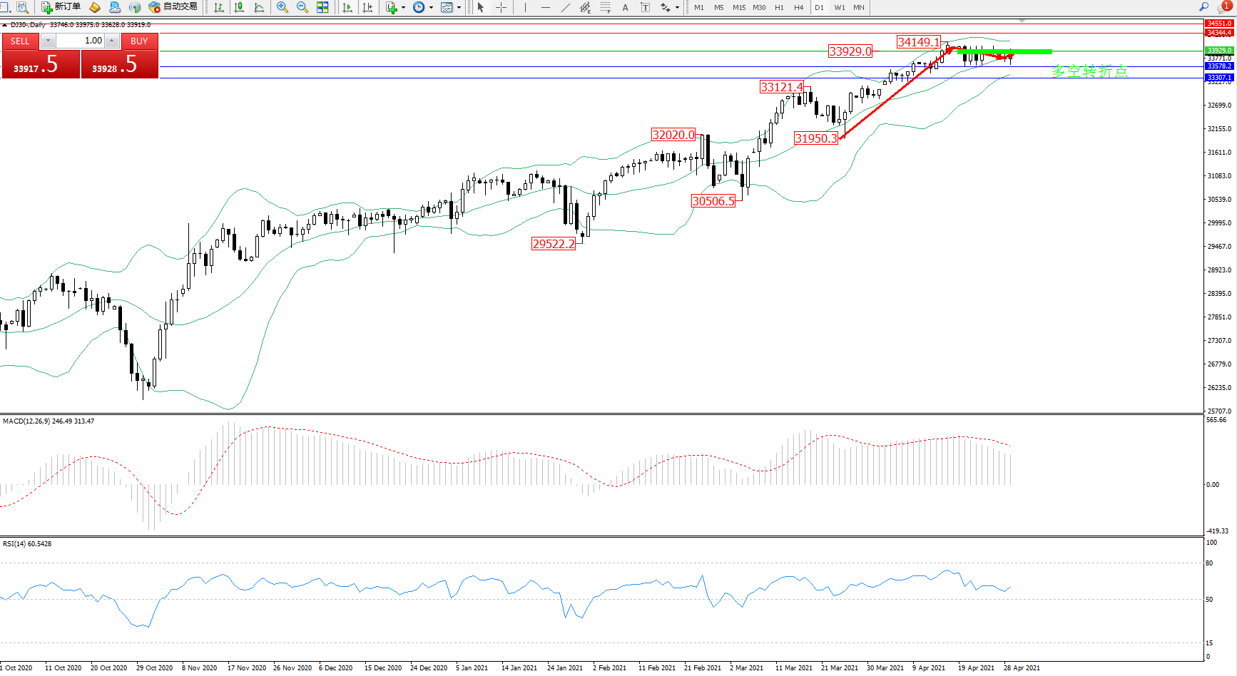 交易策略:33929上方看涨,目标34344、34551