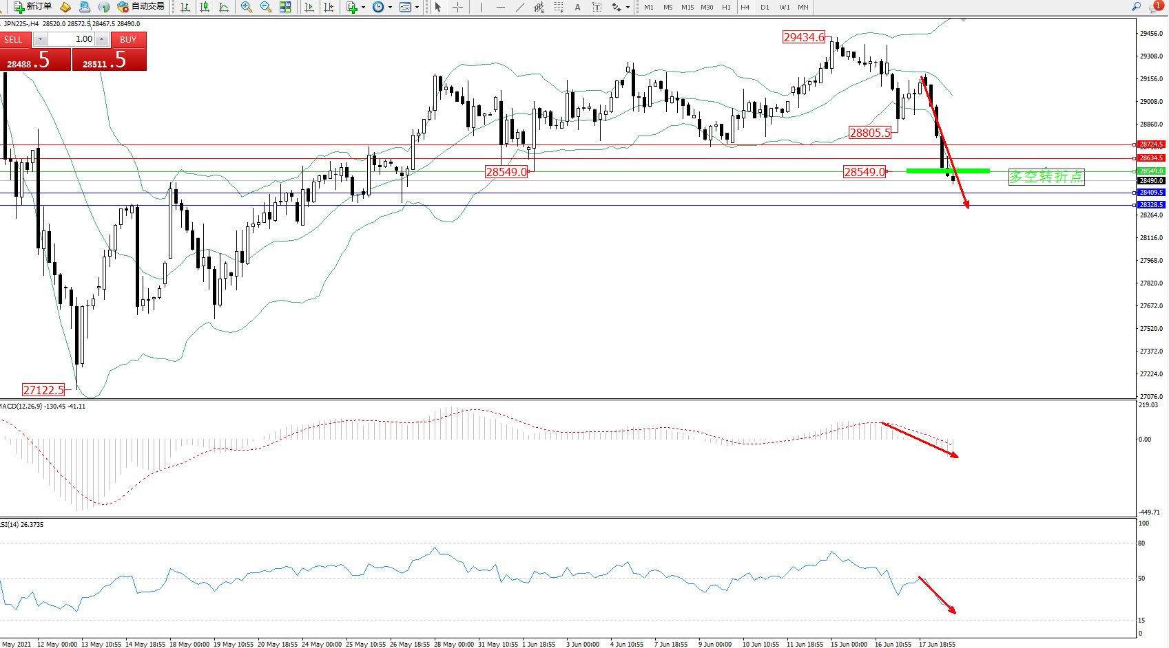 技术点评:空头动力延续布林带指标下轨附近不断震荡向下移动,跌破前期跌28549位置后不断下探,跌势未见有止步迹象,布林带指标呈张口走势持续中,关注下轨附近节点,MACD指标处于0轴线下方空头区域维持震荡下行中,RSI指标处于50均衡线下方空头区域维持震荡不断下移中;