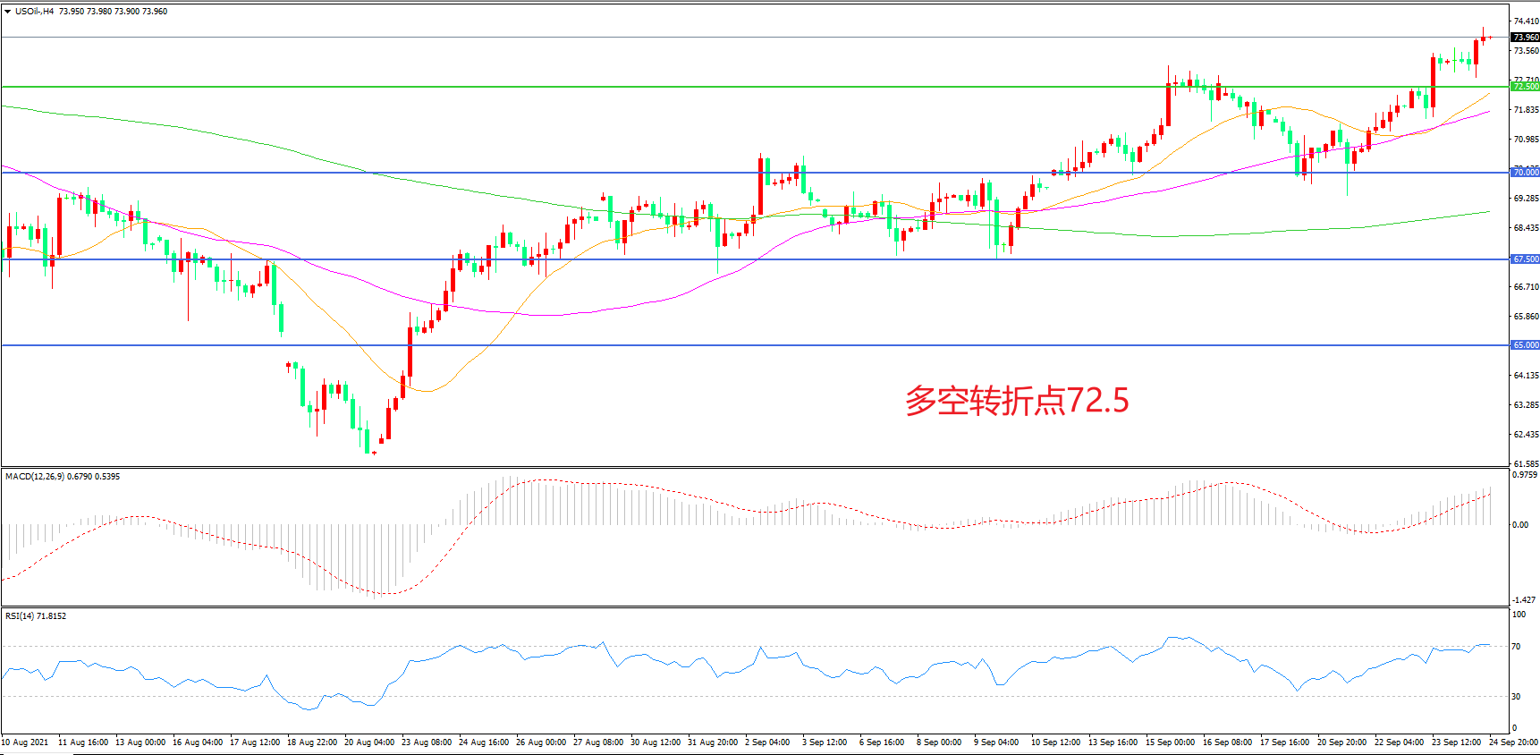 4小时图看,油价长阳拉升,短期走势偏强,均线系统形成下方支撑,MACD红柱增加,RSI指标走平,日内震荡上行概率较大。