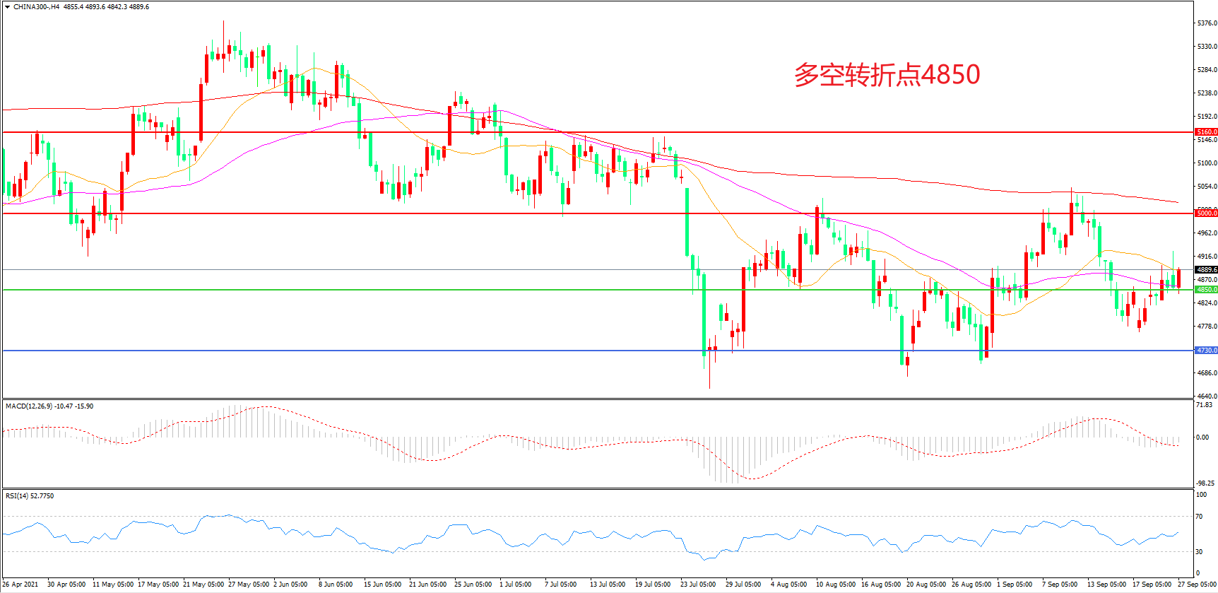 4小时图看,沪深300呈现冲高回落形态,但4850一线逐渐站稳,21周期均线成为上方阻力,MACD绿柱缩短,RSI指标走平,日内延续上行概率较大。