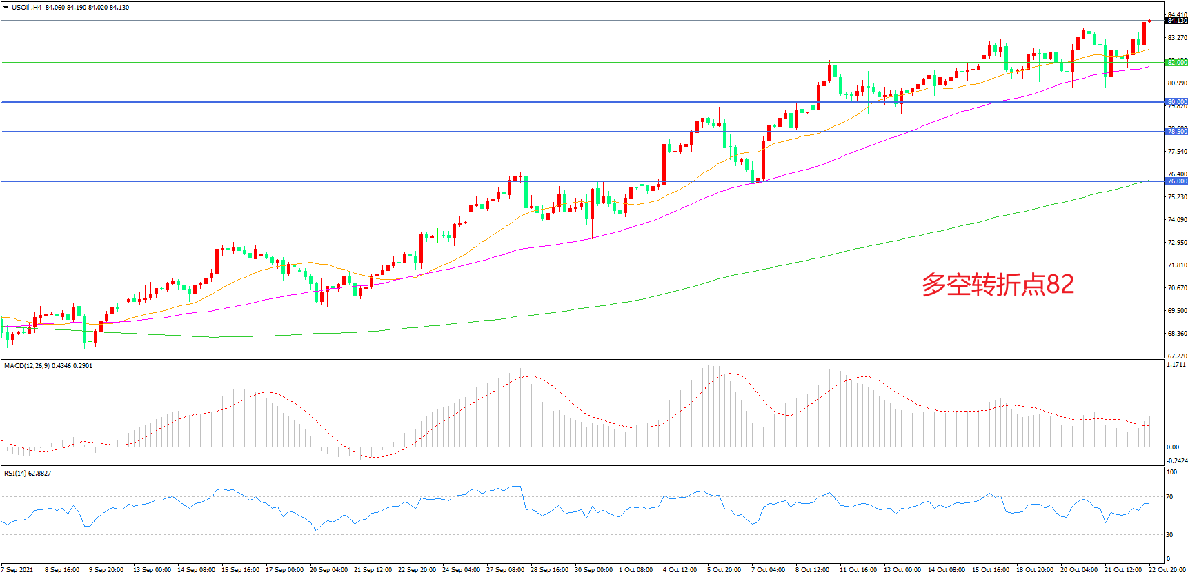 4小时图看,油价以均线系统为依托,整体呈现上行形态,MACD红柱增加,RSI指标走平,日内延续上行概率较大。