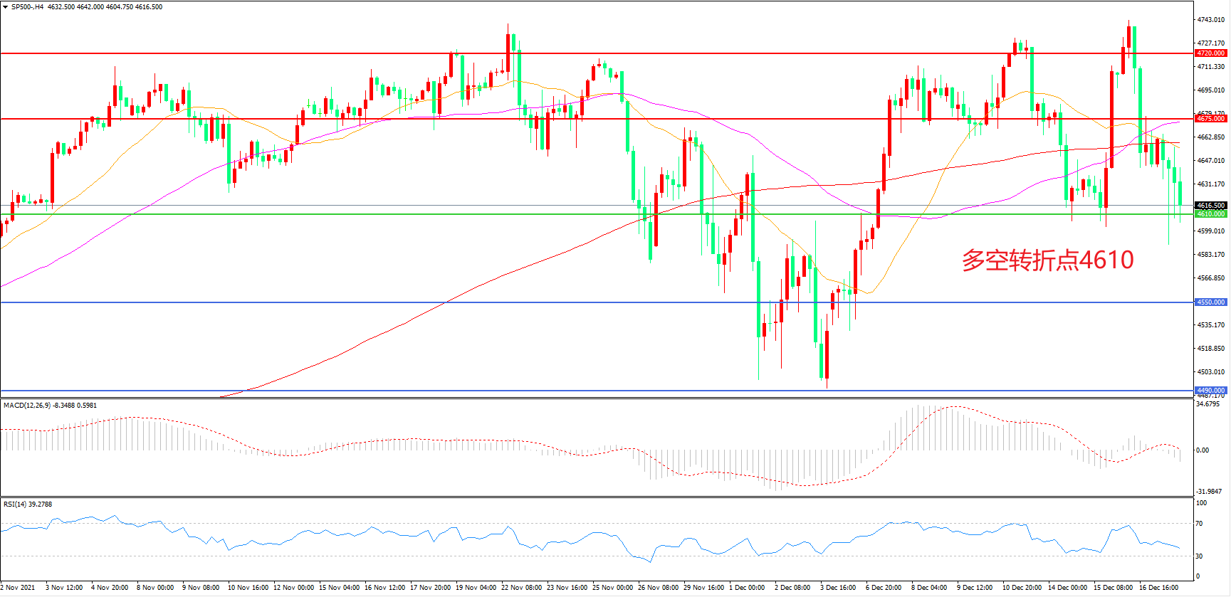 4小时图看,标普500自高位长阴回落,短线走势相对低迷,均线系统粘合形成阻力,4610成为多空分水岭,MACD绿柱增加,日内震荡下行概率较大。