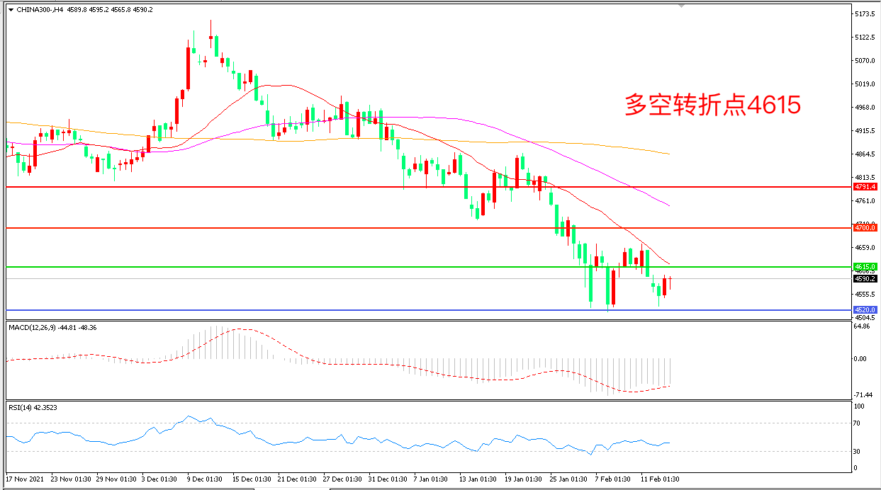 4小时图看,沪深300回踩4630后小幅反弹,短线跌势暂缓,但均线系统仍呈空头排列, MACD绿柱缩短,RSI指标走平,日内延续震荡概率较大。