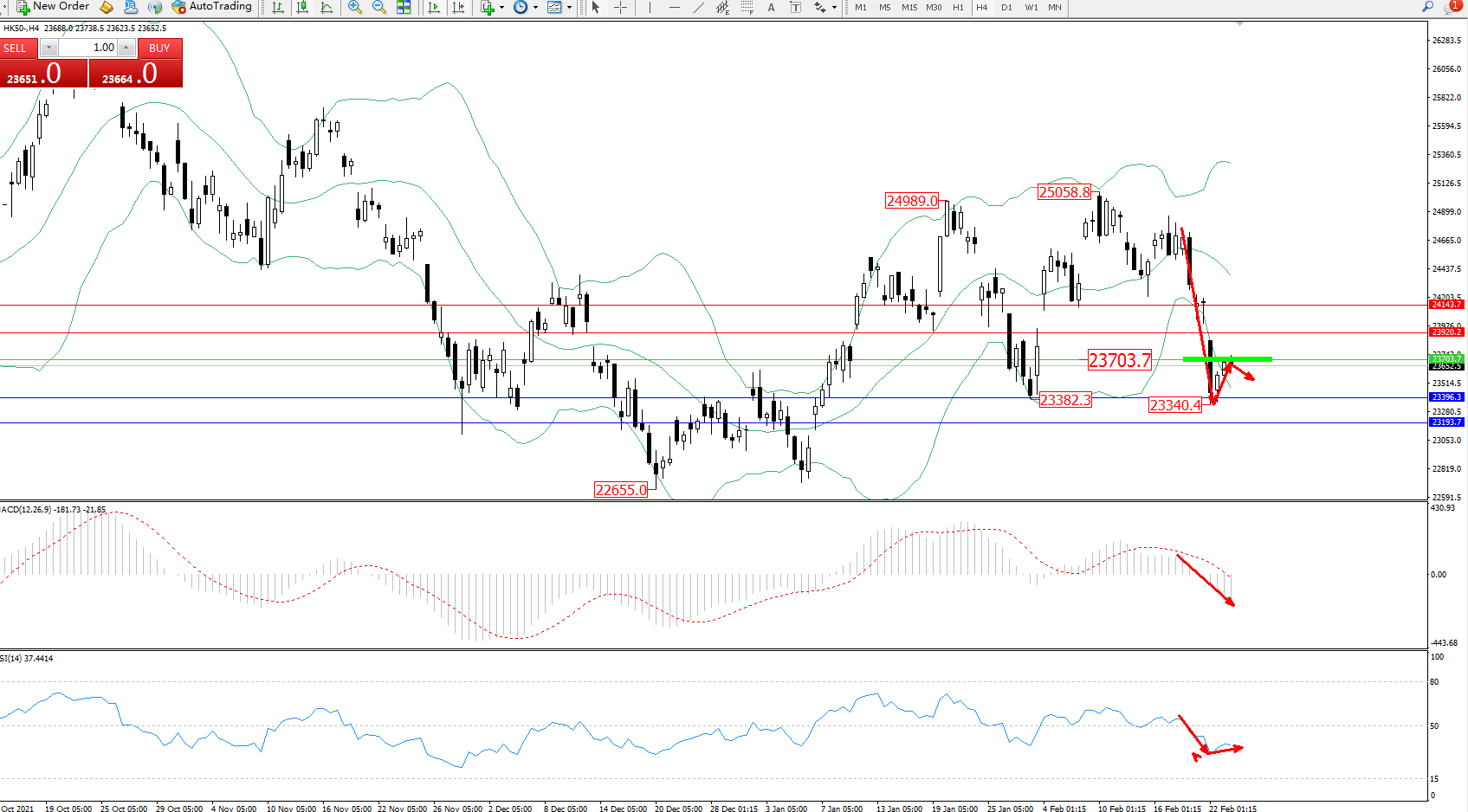 技术点评:空头动力急速下挫,抵达23340位置后开始短暂震荡回升,布林带指标呈张口走势后开始缓慢有收口迹象,空头下行趋势或将延续,MACD指标处于0轴线下方空头区域维持整理平移,RSI指标处于50均衡线下侧整理平移中;