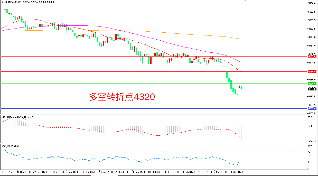4小时图看,沪深300 高开低走,短线有止跌迹象,但均线系统仍呈空头排列, MACD绿柱增加,RSI指标走平,日内震荡下行概率较大。