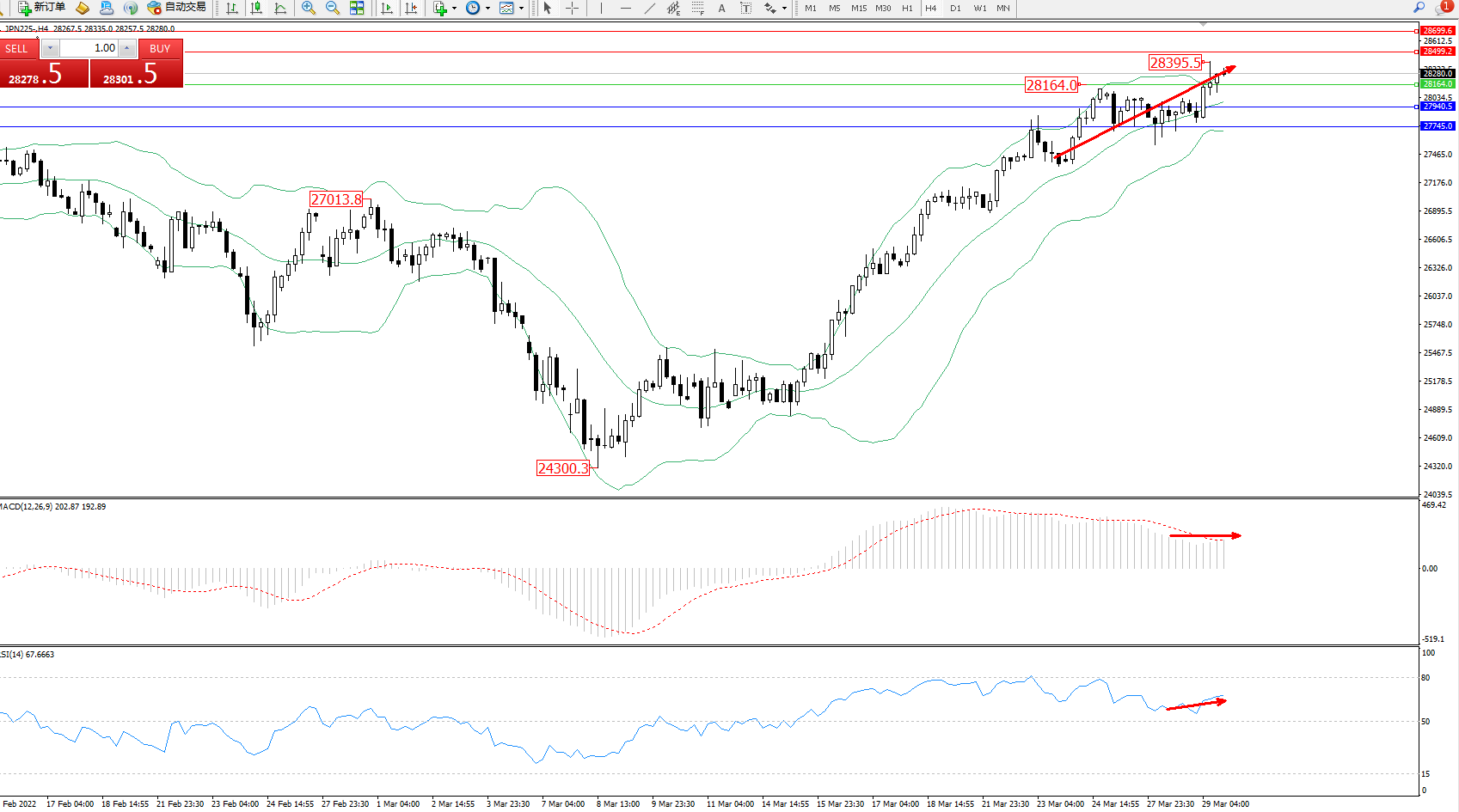 日经225指数3月29日(周二)收盘上涨278.61点,涨幅1.00%,报28222.50点。日本债市和汇市交易员周二准备再次迎来动荡的一天,日本央行势将继续进行空前的干预,以遏制收益率的飙升。尽管日本央行承诺未来三天将无限量购买基准债券,但预计债券仍将承压。虽然隔夜美国国债收益率回落可能暂时带来喘息之机,但不在日本央行控制范围内的长期日本国债可能表现脆弱,特别是如果全球市场出现进一步的波动。此次干预凸显出央行维持宽松政策的承诺,行长黑田东彦早些时候曾表示,即使通胀率大幅上升,政策也将保持不变。但此举未能推动收益率走低,10年期国债收益率周一收于0.25%